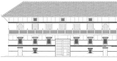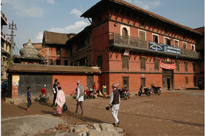 The northern extension of Patan Darbar, the Bahadur Shah Wing is a major departure from the characteristic courtyard configuration of the other palace buildings. The rectangular building consists of a tall upper floor reception hall (baithak) above two shorter floors. The reception hall's large-span interior, soaring ceilings, and use of a fireplace depart radically from all interior spaces of previous eras, making Bahadur Shah the first building of its kind in the valley. The building was constructed in the 1790s by the regent Bahadur Shah after his return from Benares, where he would have been exposed to the Anglo-Indian idiom favored by North Indian nawabs. The composition of the facade is governed by regularized fenestration around a two-story high gate at the center to allow elephants to enter the backyard stables.