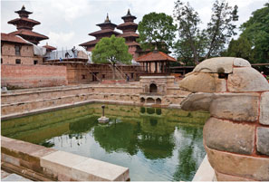 The Bhandarkhal water tank is the focal element of the garden behind Patan Darbar. Both the tank and the nearby Tusha Hiti are connected to Patan's historic water infrastructure, which includes 5 aquifers, 11 reservoirs, 28 drinking water fountains, and 34 step-wells. The Lohan Hiti water spout on the east side of the tank was once the main source of water for Patan Darbar. Prior to restoration, the tank was in a structurally unstable condition and lacked foundations. Monsoon rains would drain into the ground within hours, indicating the failure of the traditional black clay waterproofing system. During the recent restoration, new brick foundations and retaining walls were built, a pond liner was added to prevent water leakage, and the surviving stone carvings were saved and reinstalled.