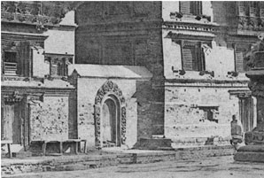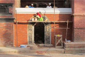 The two stone gates standing on either side of the Degutale Temple feature rare Malla-period bas-relief figures. Built in the 17th century, the gates are set against the brick walls of two small courtyards adjacent to Patan Darbar Square. Both gates collapsed in the 1934 earthquake, were subsequently reconstituted, and have since suffered from neglect and inadequate restoration. The present restoration began with the removal of individual stone components from both gates. The removal of damaging Portland cement infill was a difficult task that required the technical expertise of a stone conservation team from the University of Applied Arts Vienna.