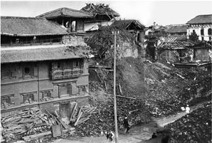 This impressive temple houses an actively worshipped shrine to Taleju, the tutelary goddess of the Malla kings. The rooftop temple, with three-tiered roofs of octagonal shape, was consecrated in 1671 by Srinivasa Malla. The top two tiers collapsed during the 1934 earthquake and were subsequently rebuilt. Prior to the recent restoration, the temple was structurally unstable and in danger of collapsing again. The most unusual feature of the building is its massive masonry core, extending uninterrupted from the ground floor to the sanctum on the third floor. Essentially a vertical extension of the ground, the core may have been built for religious rather than structural reasons, since it is believed that the Taleju deity must have a connection to the earth.