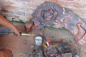 Replacement arches were poorly fitting, the use of cement mortar damaged the stone plinth, and the copper sheeting was crudely fastened with nails instead of hidden rivets. Only one of the four original chepa arches (depicting the head of a dragon devouring a snake) survived. Metal craftsmen from Patan were able to replicate and fabricate new sheeting where necessary. The skill of local craftsmen in the art of fire-gilt repousse made it possible to match the quality of the surviving arch on the basis of a detailed to-scale drawing.